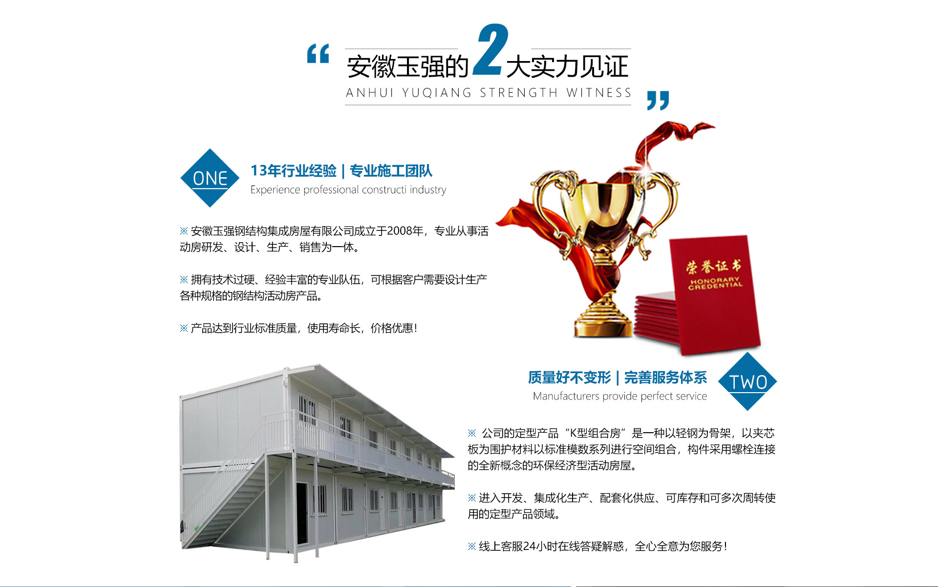 安徽玉強(qiáng)鋼結(jié)構(gòu)集成房屋有限公司是一家集研發(fā)、設(shè)計(jì)、生產(chǎn)、銷(xiāo)售服務(wù)于一體的活動(dòng)房與集裝箱制造企業(yè),公司隊(duì)伍具有多年鋼結(jié)構(gòu)制作及產(chǎn)品檢測(cè)經(jīng)驗(yàn),嚴(yán)格按照鋼結(jié)構(gòu)標(biāo)準(zhǔn)要求制作、檢測(cè)。致力于提供研、產(chǎn)、銷(xiāo)、于一體,有著多年積累的先進(jìn)生產(chǎn)技術(shù)和豐富工作經(jīng)驗(yàn),采用精良的工藝技術(shù),生產(chǎn)美觀(guān)大方的定型產(chǎn)品,長(zhǎng)期以來(lái),受廣大用戶(hù)的信賴(lài)和支持。歡迎您的來(lái)電咨詢(xún)。